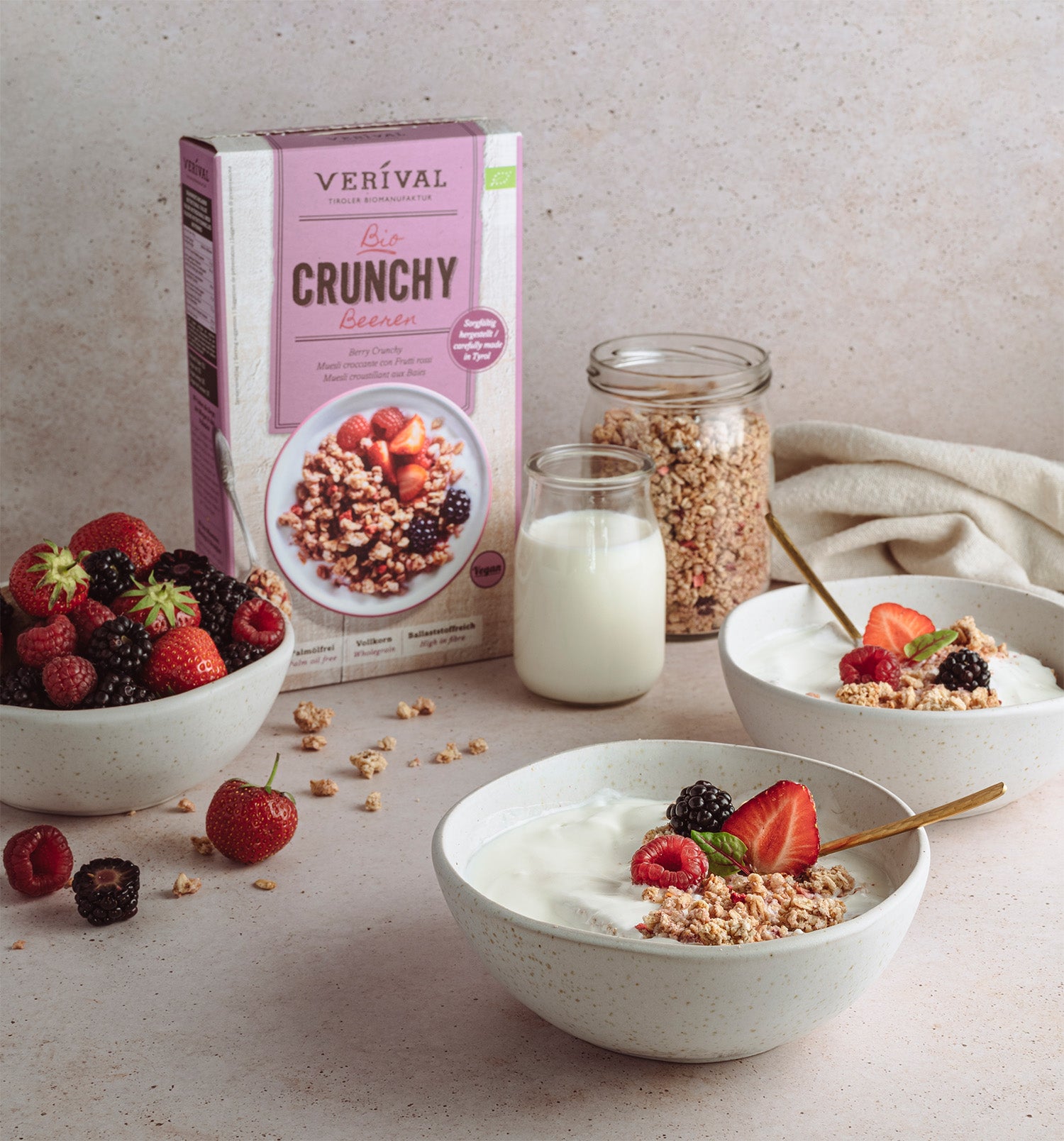 Découvre chez Verival de délicieuses variétés de crunchy, de muesli croustillant et de granola. Nos crunchys croustillants ne contiennent que les meilleurs ingrédients bio comme l'épeautre, des noix sélectionnées et de la noix de coco, cuits dans de l'huile de tournesol respectueuse de l'environnement. Chaque granola est fabriqué à la main au Tyrol, et nous sucrons avec parcimonie avec du miel pour préserver le goût naturel. Disponible directement chez Verival en ligne.